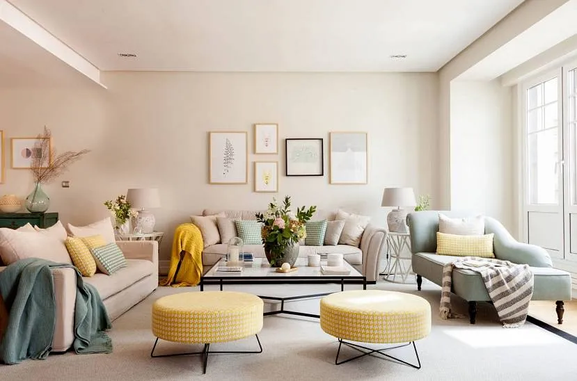 Гостиная гармонична в теплых и холодных пастельных оттенкахИсточник arlind.ru