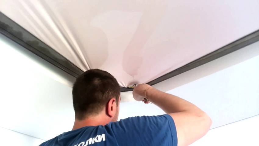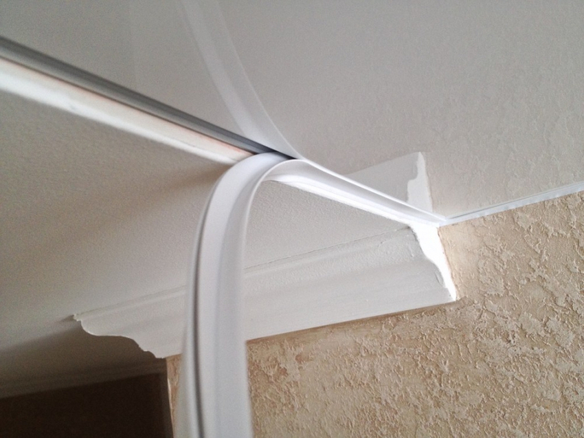Кстати, монтаж такого потолка достаточно прост по сравнению с установкой той же подвесной конструкции. Сначала на стены устанавливается специальный багет, а на него натягивается заранее вырезанное полотно.