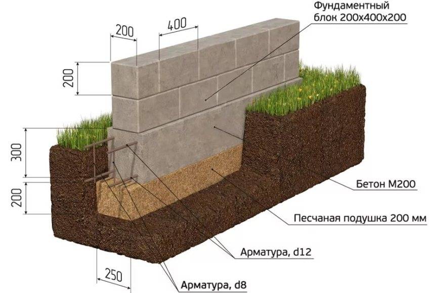 После подготовки траншеи изготавливается песчаная подушка. Толщина слоя песка со щебнем, при условии что грунт пучинистый, может достигать 30–35 см. Для нормальной почвы достаточно 15 см. После того как изготовлена подушка можно приступать к установке блоков.