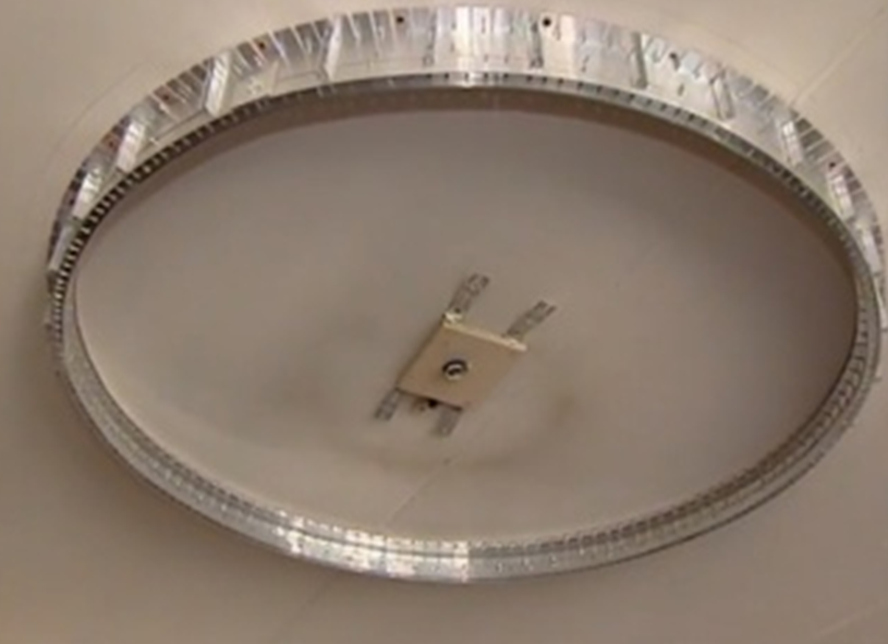13. Чтобы полотна не нагревались от зажженных светильников, нащупайте их корпуса и приклейте в этих местах специальные пластиковые кольца. В качестве дополнительной профилактики нагрева, приобретайте светодиодные лампы, которые не греются до больших температур.