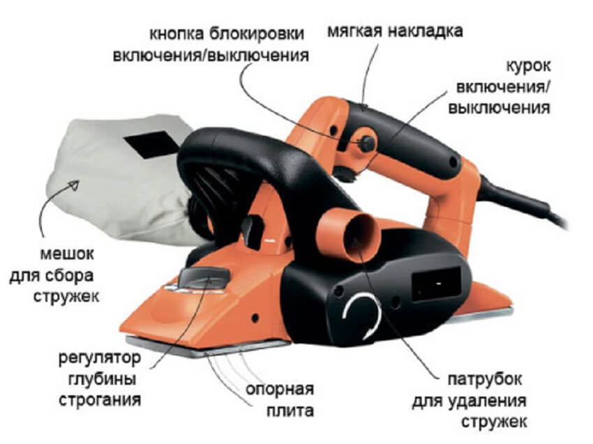 Классический ручной электрический рубанок состоит из следующих элементов: