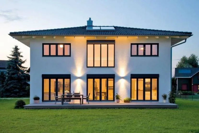 Вечером однообразный фасад двухэтажного дома будет выглядеть эффектнее, если присутствуют элементы архитектурного освещения.