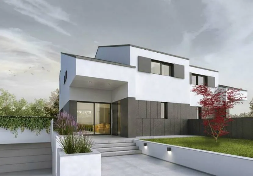 При обустройстве экстерьера двухэтажных домов используют полимерные и натурального происхождения материалы.