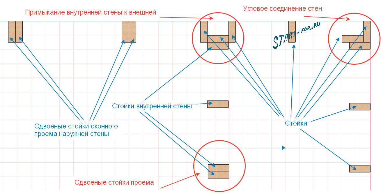 Для разметки стоек в натуре вначале размечаются стойки дверных и оконных проемов, их мы двигать и убирать не будем. Затем размечаются места примыкания внутренних стен к внешним, и места соединения внутренних стен между собой. Основные типы соединений изображены на этом рисунке.