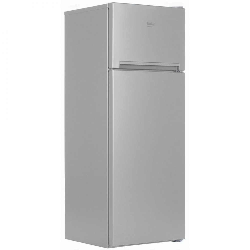 Двухкамерный холодильный шкаф с морозилкой на 75 л. Располагается она внизу. Полезный объем отделения для охлаждения и сохранения свежести продуктов – 181 л. Имеет стандартные габариты – 60x64x167 см и устанавливается на отдельное место. За разморозку двух камер отвечает система No Frost. Замораживающая способность – до 3,5 кг/сут. Количество полок в морозилке и в холодильном отсеке по три штуки. Оснащен обычным компрессором, но относится к высокому классу экономичности. Поддерживает холод после отключения из сети еще в течение 13 часов. Управление электромеханическое, то есть при помощи ручки термостата. Уровень шума – до 43 дБ. Полки выполнены из стекла, а сам корпус агрегата из металла и пластика в красивом серебристом цвете.