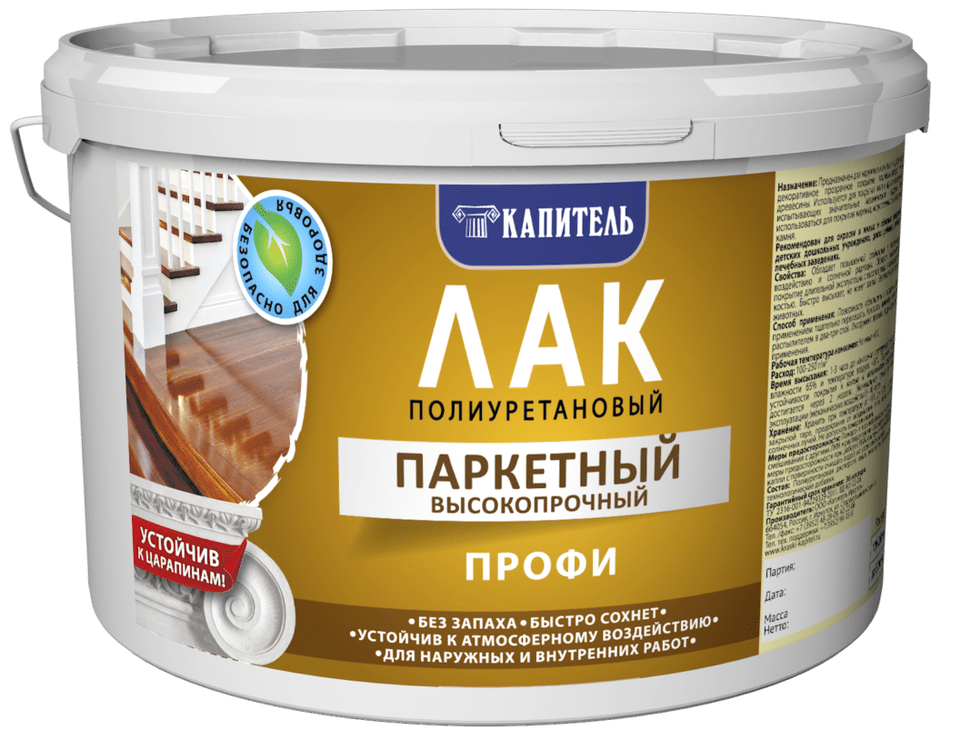 Многие производители выпускают двухкомпонентные полиуретановые лаки для паркета в профессиональных сериях: для спортзалов, для торговых площадей и т. д. Наиболее безопасные – водные, так как практически не имеют запаха, а инструменты после использования можно промывать простой проточной водой, а не растворителем.