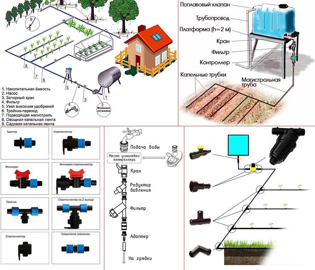 Монтаж систем капельного орошения нормального напора производится из труб ПНД с толщиной стенок 2-4 мм. При их запитке от общего напорного бака на чердаке одноэтажного дома в магистраль может быть врезан насос подкачки. Собираются трубопроводы нормального напора на фитингах с поджимом, слева внизу на рис. Ленты отводятся от магистрали с помощью стартконнекторов, выполняющих функции тройников-отводов и редукторов давления. Через стартконнекторы с кранами подключают ленты или участки, давление в которых должно быть существенно ниже нормального напора; в данном случае – теплицу, короткую одинарную грядку и сад.