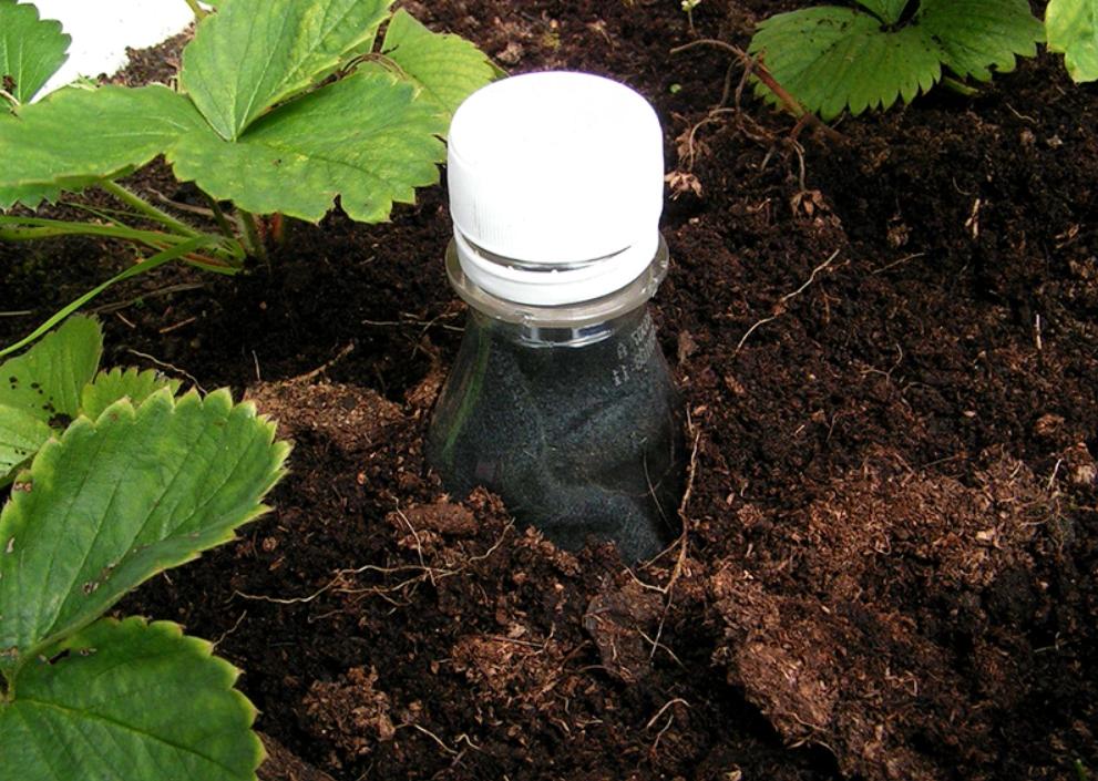 Простой вариант — подземный полив: бутылку закапывают в землю, а горлышко остается над поверхностью. При уменьшении количества воды ее доливают. Преимущество этого метода — отсутствует корочка на поверхности, которую нужно рыхлить. Например, в парнике одному кусту помидора будет достаточно 1 л жидкости на 7 дней.
