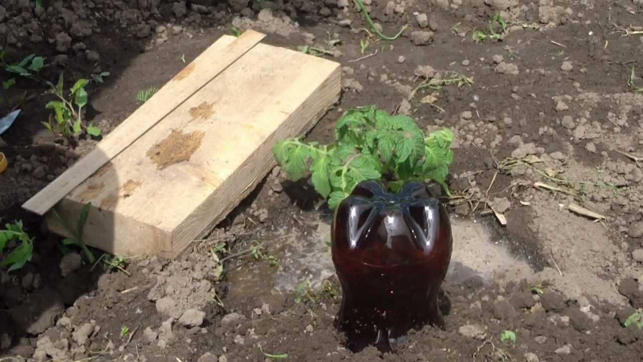 Простой вариант — подземный полив: бутылку закапывают в землю, а горлышко остается над поверхностью. При уменьшении количества воды ее доливают. Преимущество этого метода — отсутствует корочка на поверхности, которую нужно рыхлить. Например, в парнике одному кусту помидора будет достаточно 1 л жидкости на 7 дней.