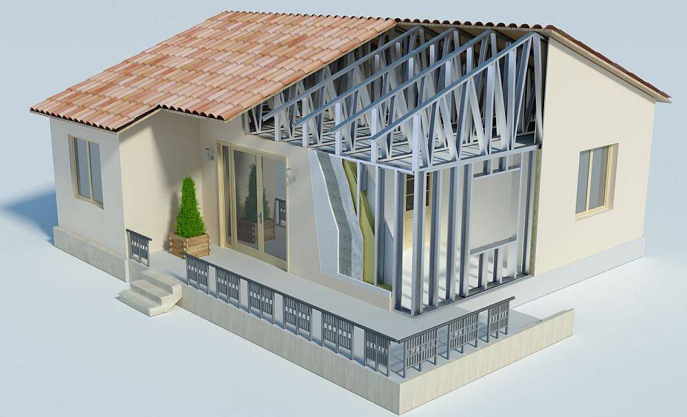 ЛСТК — каркас изготавливается из специально разработанных стальных тонкостенных профилей с последующей обшивкой.