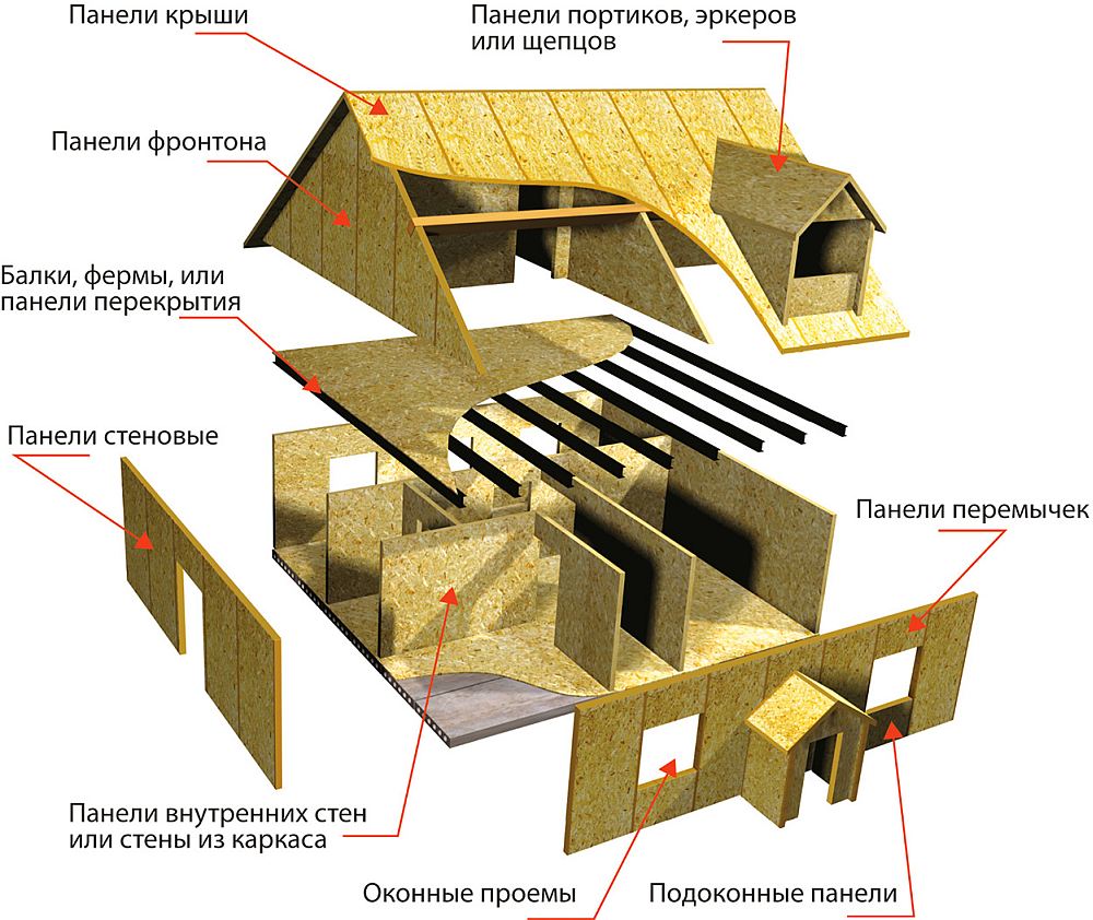 - Щитовой. Монтируется из заранее изготовленных щитов, состоящих из жёсткого каркаса, обшивки, слоя утеплителя и облицовки. Наиболее часто они изготавливаются из СИП панелей.