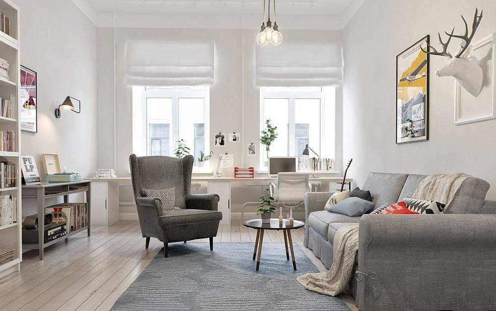 Каркасный дом в скандинавском и шведском стилях характеризуется окрашенными белыми стенами, темным полом из натурального дерева и балками на потолке. Интерьеру присущ минимализм и максимально функциональная простая мебель.