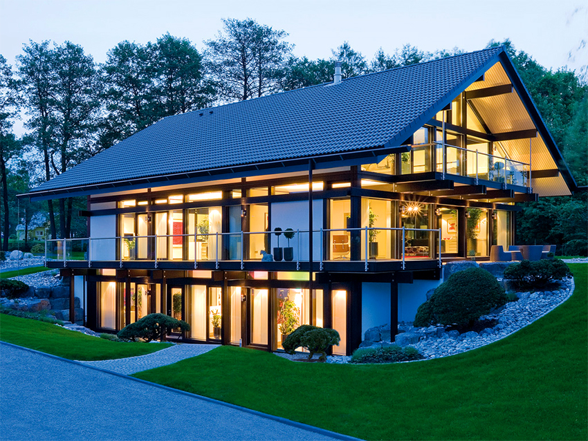 На данный момент необычайно популярны фахверковые дома с панорамными окнами
