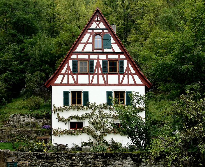 - Использование контрастных цветов. На фото немецких домов фахверковые постройки обязательно выделяются красной черепичной крышей и массивной дверью, которая покрашена контрастным (относительно фасада) цветом.