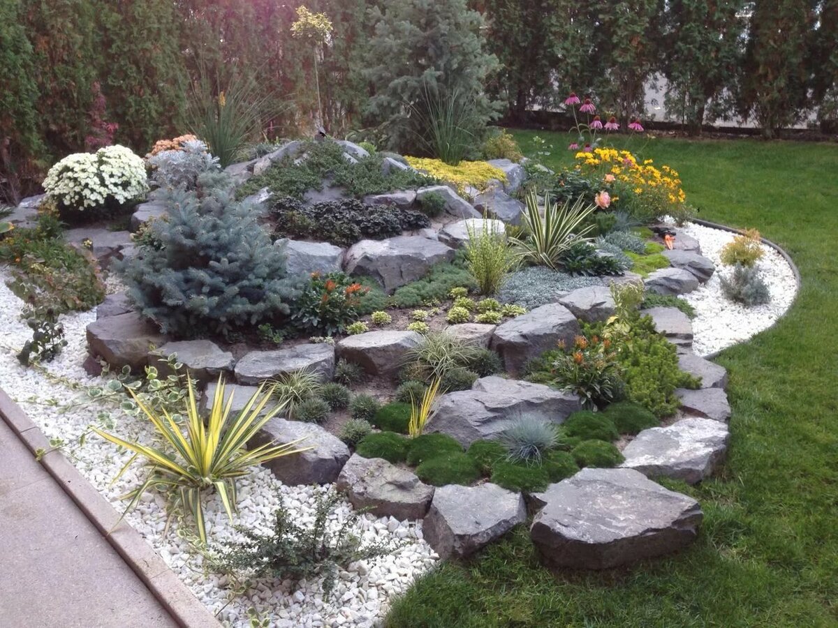 - Рокарии. Растения в клумбе дополняет декор из камней, популярное название – каменные сады;
