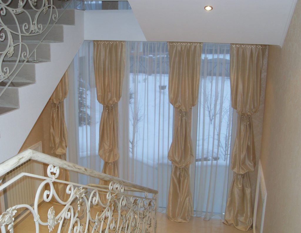 Так, штору на высокое окно на лестнице целесообразно закреплять на карнизах большей ширины. Это сделает пространство более уютным. Однако высота окна часто обеспечивается за счет того, что оконный проем заканчивается буквально под самым потолком. Поэтому при навешивании шторы на высокое лестничное окно велик риск того, что обычные карнизы для них закрепить не удастся. Но это не значит, что нужно выбирать коротенькую модель, которая крепится в сам стеклопакет.