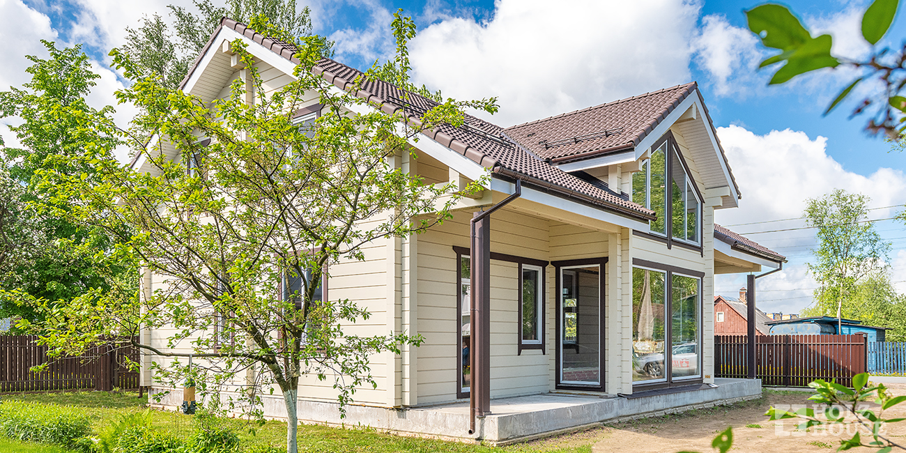 2-х этажный дом общ. пл. 168,7 м², где второй этаж является мансардным (потолок 2-го этажа и крыша являются одним целым — из SIP панелей).
