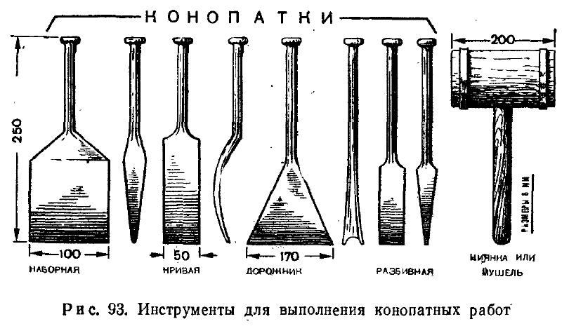 - конопатка-«дорожник» с лезвием шириной до 170 мм и толщиной порядка 8-15 мм с пазом по длине лезвия глубиной до 10 мм (применяется для формирования валиков из скрученных прядей пакли). Различают три вида «дорожника», которые используются для работы с широкими, средними и узкими швами;