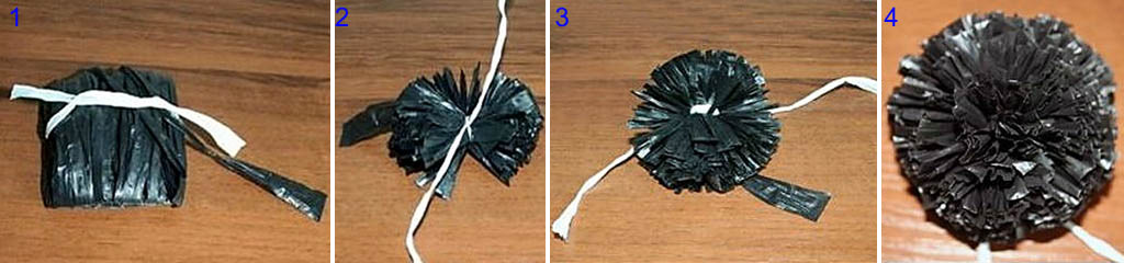 - Если диаметр помпона (20-35 см в зависимости от того, каких размеров взяты пакеты) маловат, несколько их связываются вместе или привязываются к строительной сетке.