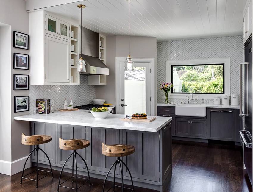 Фото серо-белых кухонь в интерьере демонстрируют, в какой мере удачным может быть вариант акцентного комбинирования, где один из цветов применяется более активно, а второй присутствует в некоторых элементах. Акцентный остров – еще один современный способ сочетания тонов на кухне в бело-сером цвете. Фото указывают на примеры оформления как белого острова на фоне серой кухни, так и наоборот.
