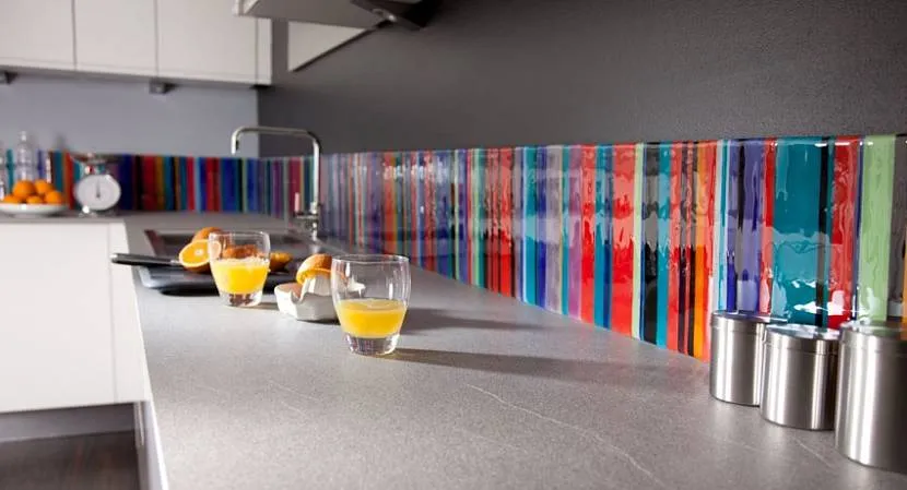 Среди остальных вариантов можно использовать пластик, плитку и даже стекло из разноцветных составляющих для облицовки. Также фартук ярких и сочных оттенков может быть выполнен при помощи красочной фотопечати, на которой будет присутствовать сразу несколько ярких цветов либо один основной.
