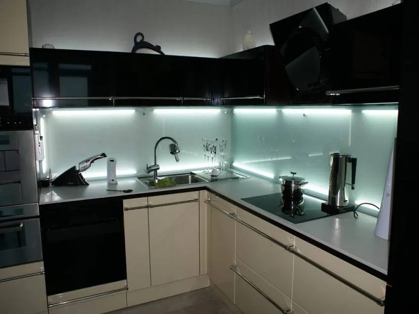 Если у кухонного гарнитура есть верхние шкафчики, то можно на их дно установить люминесцентные светильники или светодиодную ленту. Так получится равномерно осветить всю поверхность, а не точечно.