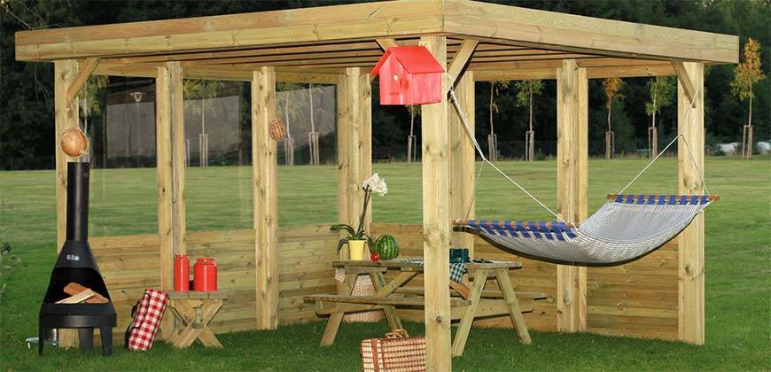 - Открытая. Практически не имеет стен (максимум, невысокие перила), но оборудована крышей. Используется только в теплое время года, оборудуется столом со скамейками, а также мангалом и барбекю поблизости.