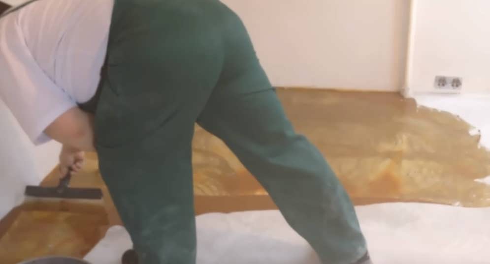 Подготавливается прозрачный полимерный раствор: компоненты смешиваются в строгом соответствии с инструкцией. Готовая смесь небольшими порциями выливается на пол, разравнивается, затем прокатывается игольчатым валиком. Прокатывание должно длиться до тех пор, пока не начнется загустевание состава, это может быть от пятнадцати до сорока минут. Время высыхания будет зависеть от толщины полимеров и условий конкретного помещения. В среднем это время составит от одной недели до трех.