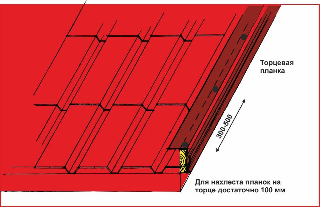 При укладывании торцевой планки, шаг саморезов выбирает в пределах одного метра. Каждая такая планка должна находиться по верху как минимум одного листа профнастила.