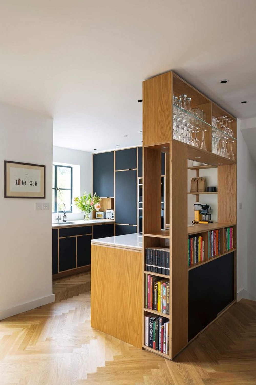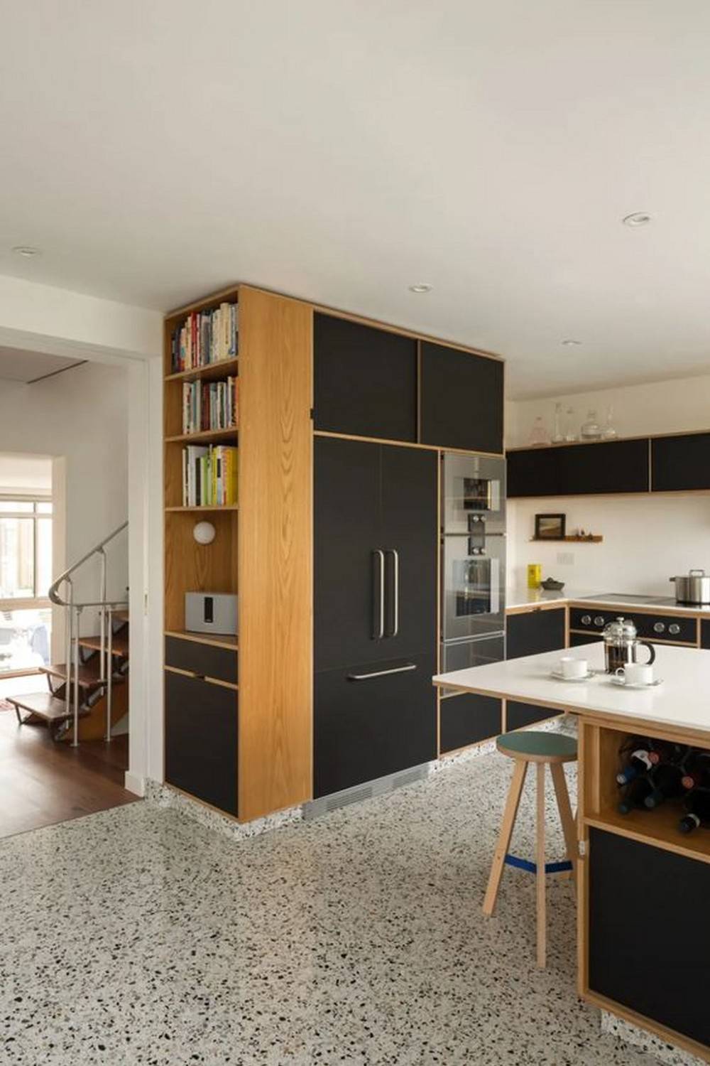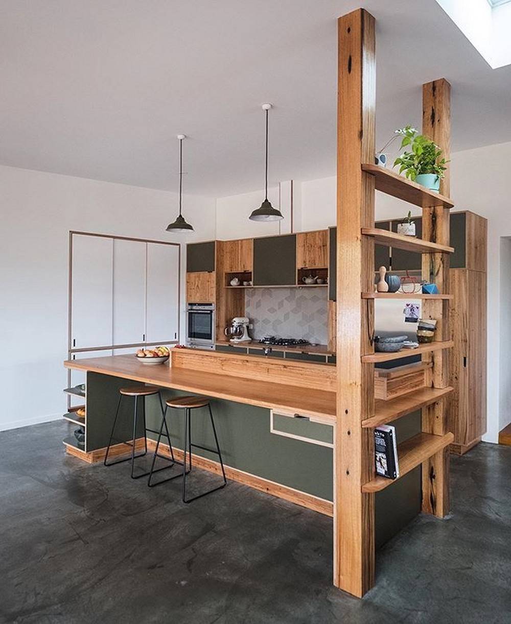 | Рис. 3. Кухня отделена от прихожей стеллажом, который выполнен из тех же материалов и в той же стилистике, что и кухня |