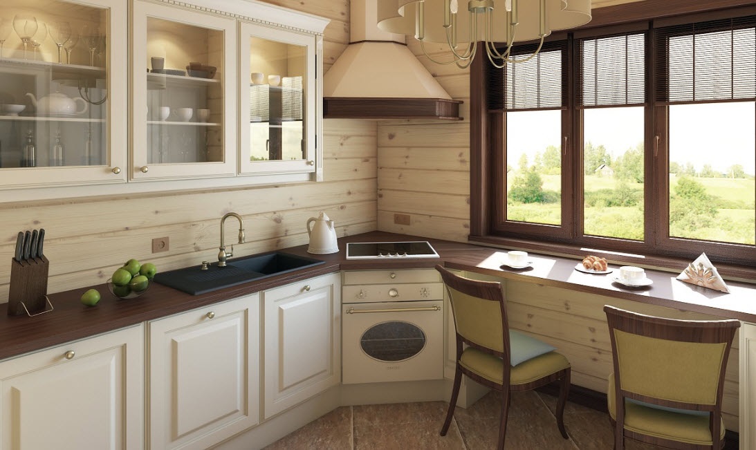Их дополняют резными деталями и коваными элементами, что придает кухне необходимый деревенский колорит, гарнитуром с открытыми полками, на которые можно разместить керамические аксессуары, горшки с цветами.