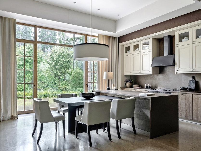 Гарнитур из дорогих пород дерева с резными фасадами и столешницами из камня, обитые тканью стулья, буфет, хрустальная люстра и лепнина на потолке – все это неизменные атрибуты классики.