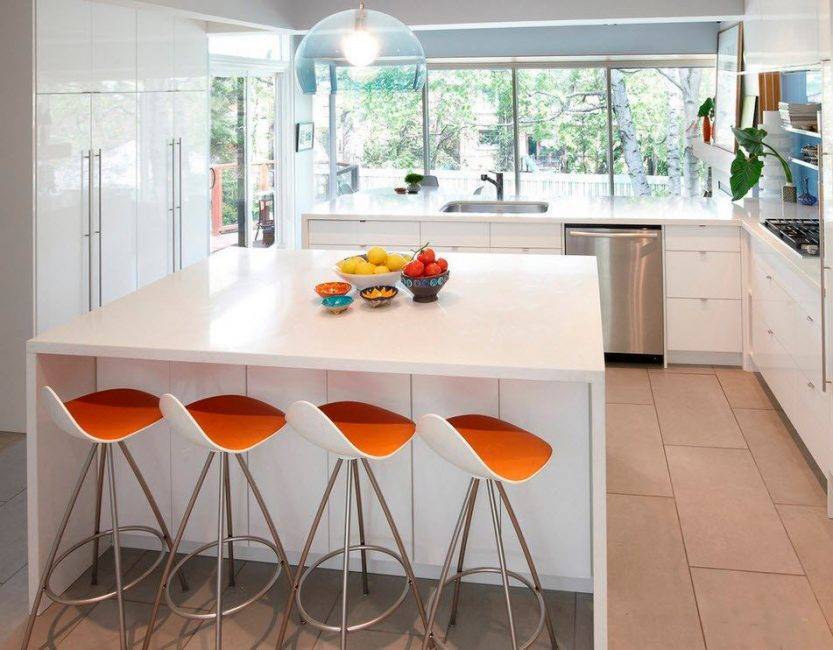 Одним из редко применяемых вариантов обустройства является применение барной стойки на кухне. Он не получил широкого распространения из-за маленькой площади помещения. Но если есть возможность, то почему бы не разнообразить интерьер? В такой кухне прекрасно будут смотреться элементы интерьера, выполненные в другом мягком цвете. Таким образом можно разбавить цветовую гамму, внести краски в светлый фон кухни и разбавить интерьер – повесить картины, поставить комнатные растения или приобрести красочный текстиль.