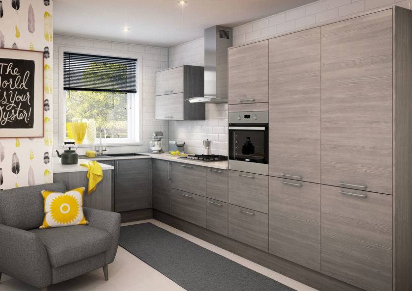 Дизайнеры рекомендуют украсить деревом серые стены на кухне и пол помещения. Из-за опасений, что древесина будет плохо реагировать на влагу, можно использовать материалы «под дерево».