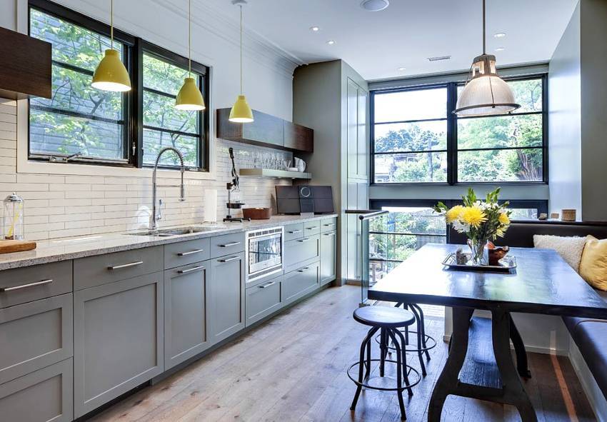 Любые оттенки серого цвета удачно сочетаются с деревом и оттеняют его теплоту, что подтверждает хотя бы серая кухня с деревянной столешницей. Независимо от стиля кухонной обстановки холодность серых тонов легко компенсировать наличием мебели из дерева и натуральных текстильных аксессуаров.
