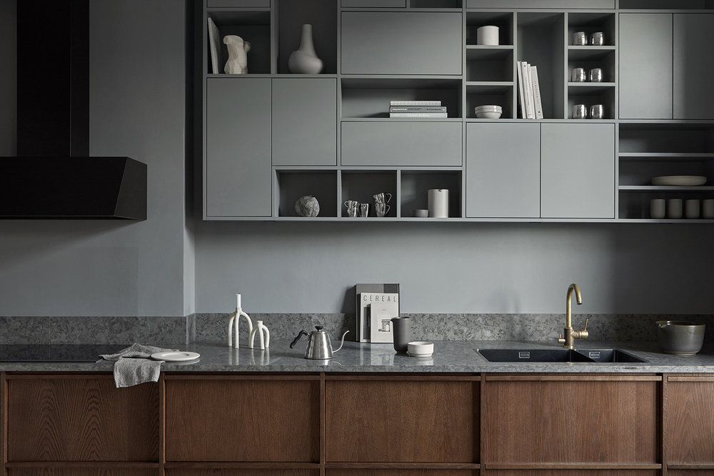 | Рис. 15-18. Минималистичная скандинавская кухня в сером цвете. Высокие верхние шкафы с фасадами без ручек |