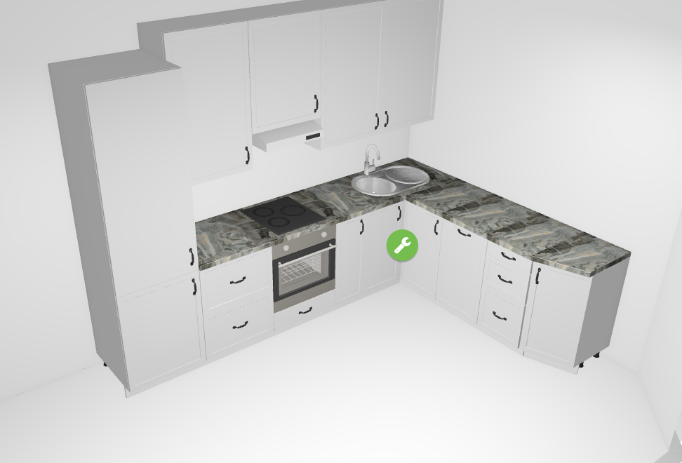 - подобрать и расставить требуемые по функциональности и подходящие по размерам элементы модульной кухни;