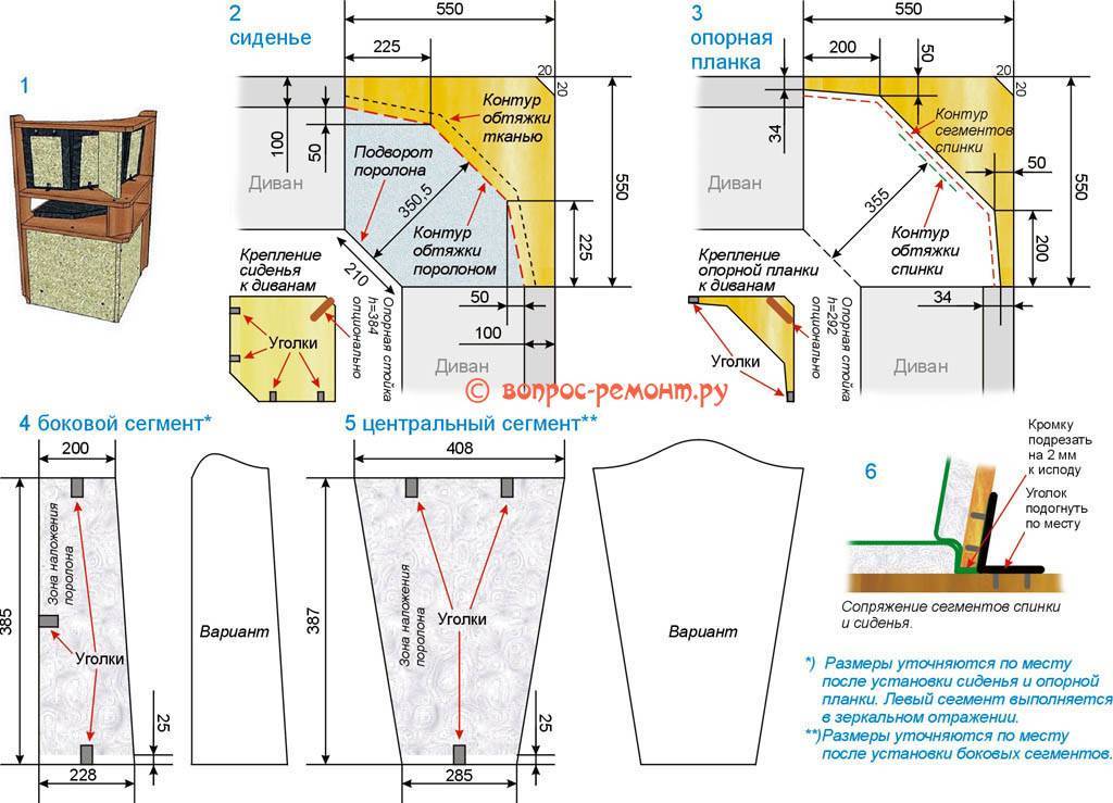 Размеры сегментов спинки нужно обязательно выверять по месту по след. причинам. Первое, на малых деталях сильно сказывается толщина обшивки. Поскольку диваны обшиты ранее, к началу изготовления угловой секции эта величина будет известна. Второе, все накопившиеся в диванах погрешности размеров сойдутся в одно именно в углу.