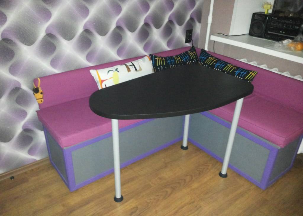 Обивочная ткань. В качестве последней лучше использовать дерматин. Кухня является местом потенциального загрязнения. Пятна от пищи, жир, напитки и т.д. способны за несколько мгновений превратить новый красивый диван в совершенного непривлекательных. Если с поверхности кожзаменителя большинство пятен можно просто удалить влажной тряпкой, то с других тканей сделать это будет более проблематично. Можно сделать комбинацию из разных тканей, однако, это хлопотно и может выйти не слишком красиво.