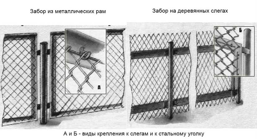 Рабицу натягивают со столба, расположенного в углу. Ее навешивают на столбы и закрепляют скобами. Еще можно привязать проволокой или приварить сварочным аппаратом.