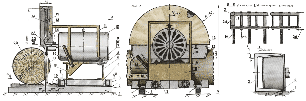 1 — шпала основная (стальная труба 80x80x3, 5 шт); 2 — подкладка (стальной лист, 40x10x1.22 шт.); 3 — полотно-направляющая (стальной швеллер № 8, L1750, 4 шт.); 4 — тележка (каретка тельфера); 5 — кронштейн нижний (стальной швеллер № 18, 2 шт); 6 — плита — основание (стильной лист s5); 7 — болт М20) (4 шт.); 8 — шайба Гровера (4 шт.); 9 — гайка М20 (4 шт.); 10 — электродвигатель асинхронный трехфазный (220 В, 5 кВт, 930 об/мин); 11 — кронштейн верхний (стальной уголок 45×45); 12 — полотно дисковой пилы; 13 — кожух защитный (стальной лист s2); 14 — штифт стальной (8 шт.); 15 — ступица дисковой пилы (Ст5); 16 — рукоять упорная (водогазопроводная труба 3/4″); 17 — горбыль отрезной; 18 — косынка упорная (стальной лист s5); 19 — гребенка (стальной уголок 45×45, L400); 20 — бревно; 21 — болт М30; 22- шайба разрезная; 23 — шайба-фиксатор (стальной лист sЗ); 24 — перекладина упорная (стальной уголок 45×45); 25 — шпала укороченная (стальная труба 80x40x3, 6 шт.); 26 — накладка для удлинения полотна (стальной лист 250x180x10, 2 шт.).