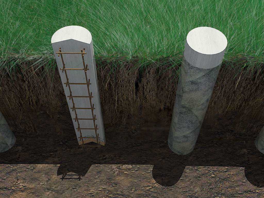 Чаще всего используются буронабивные сваи, которые представляют собой монолитную бетонную отливку в заранее подготовленную скважину.