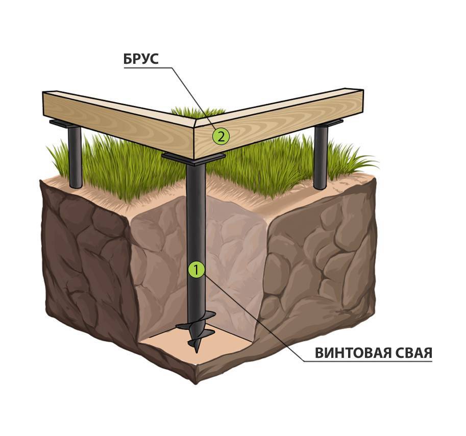 Винтовая свая представляет собой своеобразное сверло с большими лопастями. Во время ввинчивания сваи в землю происходит уплотнение грунта – это гарантирует долговечность и большую устойчивость дому. Сваи внутри заливаются бетоном, что дает прочность основанию.