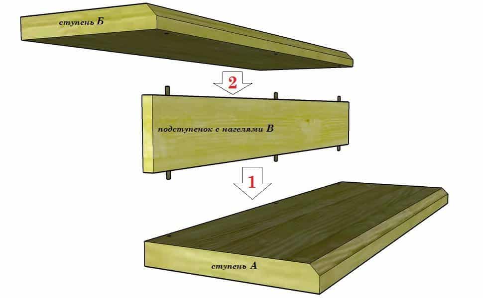 В отмеченных местах проделывают отверстия и заполняют их эпоксидной смолой. В заключение крепят подступенок. После этого на фанеру с клеем кладут проступь с прикрепленным к ней очередным подступенком. Чтобы изделие лучше приклеилось, рекомендуется использовать груз.