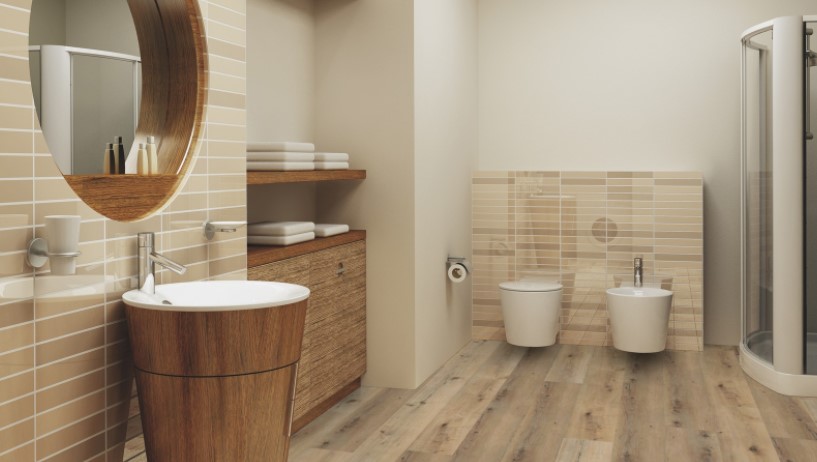 Линолеум иногда используют даже в ванной комнате, ведь существуют особые влагоустойчивые линейки этого напольного покрытия.