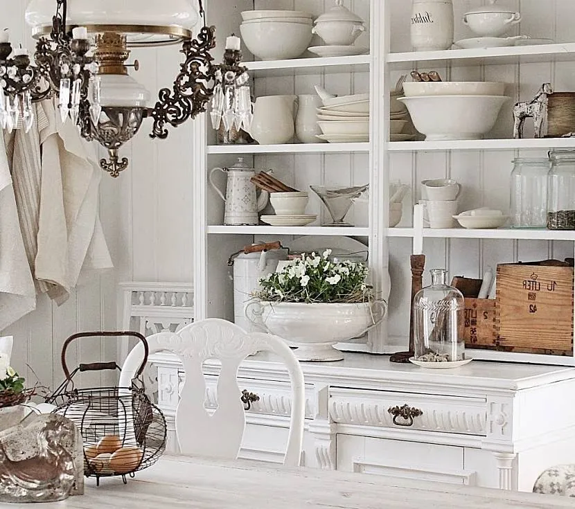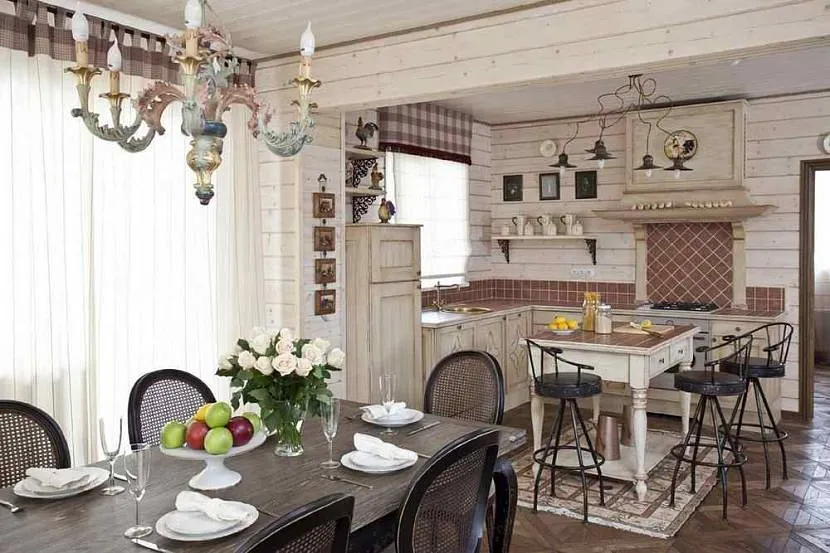 Комната обязательно должна быть просторной и светлой. Очень часто кухня совмещается со столовой. От обеденной зоны, место для готовки отделяется барной стойкой или столешницей. При этом бывает достаточно сложно в деревенском интерьере разместить современную бытовую технику. Поэтому ее часто просто прячут в шкафчики или же декорируют под старину. В качестве декора используется красивая посуда – расписные тарелки, баночки или лопатки.