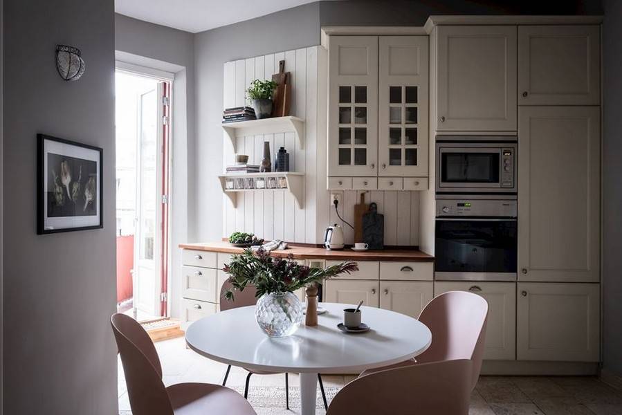 Кухню в пику светлой столовой оформить можно по канонам немецких традиций – в базальтовых красках для фартука, во множестве серых оттенков, начинить функциональной электротехникой, а на стену повесить пробковую доску в золотом багете для душевных записок членам семьи.