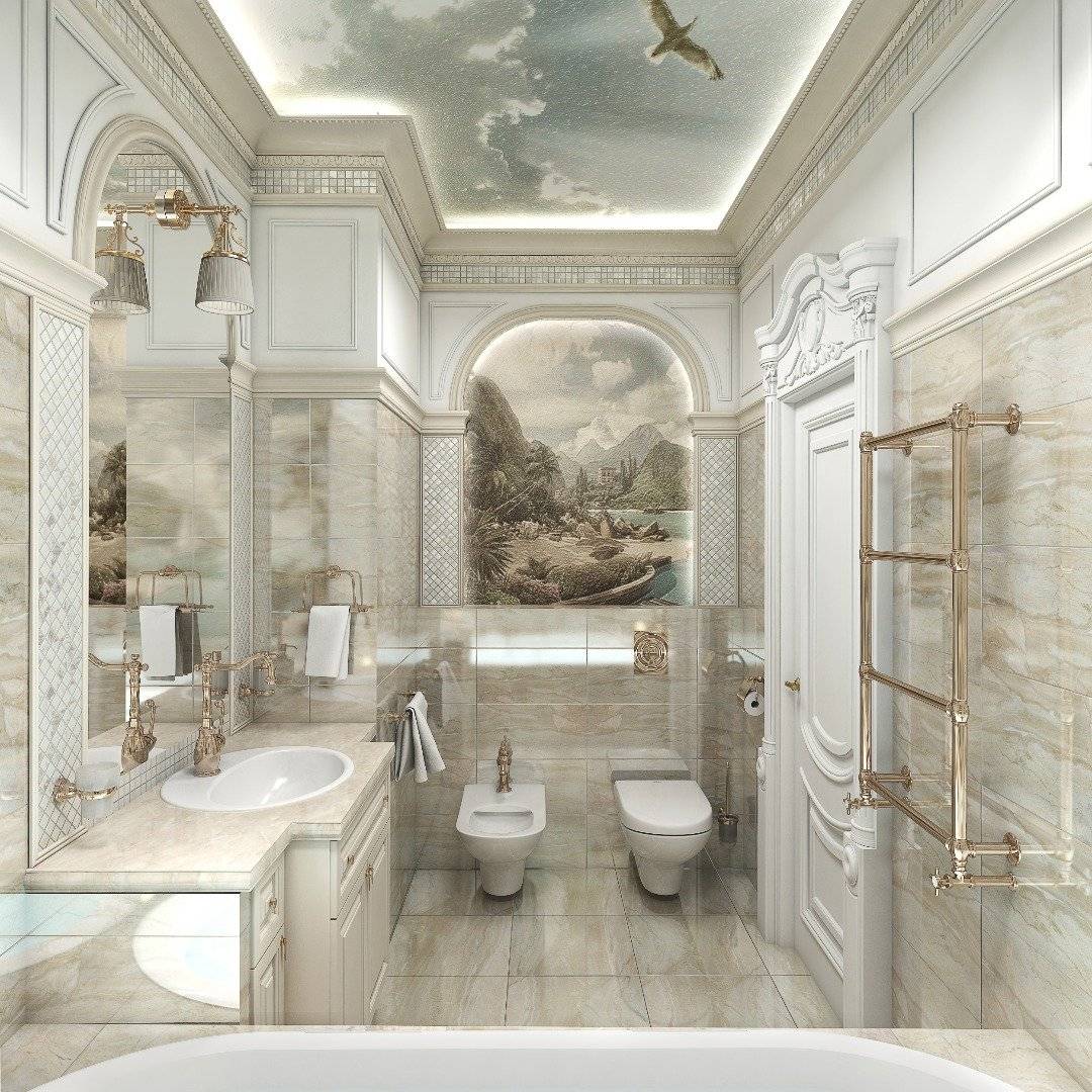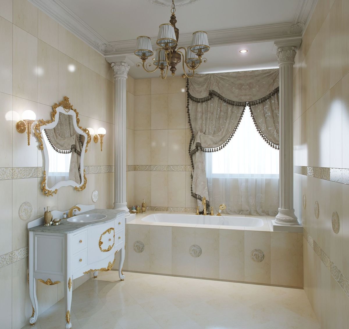 Ванная в стиле барокко отличается масштабностью и торжественностью интерьера, обязательно содержит большое количество мебели с лакированными поверхностями. Зеркала с крупной расписной рамой, покрытой позолотой, множество аксессуаров, присутствует в интерьере ванной.