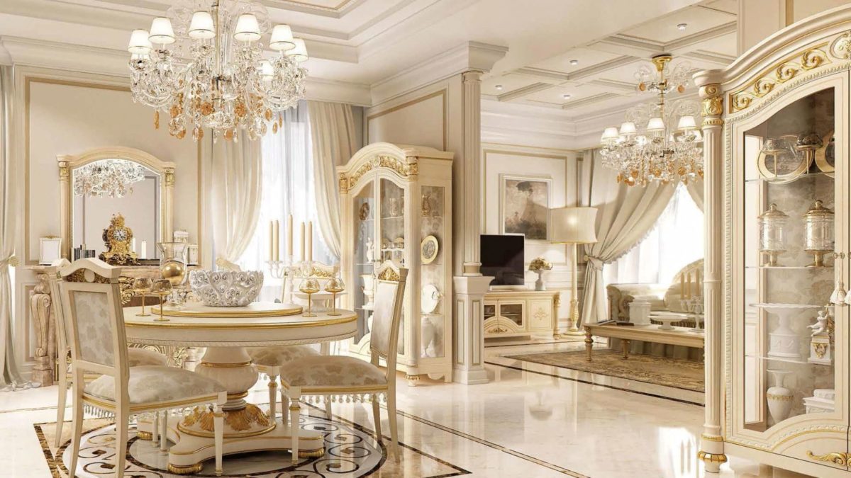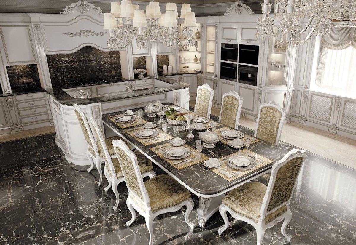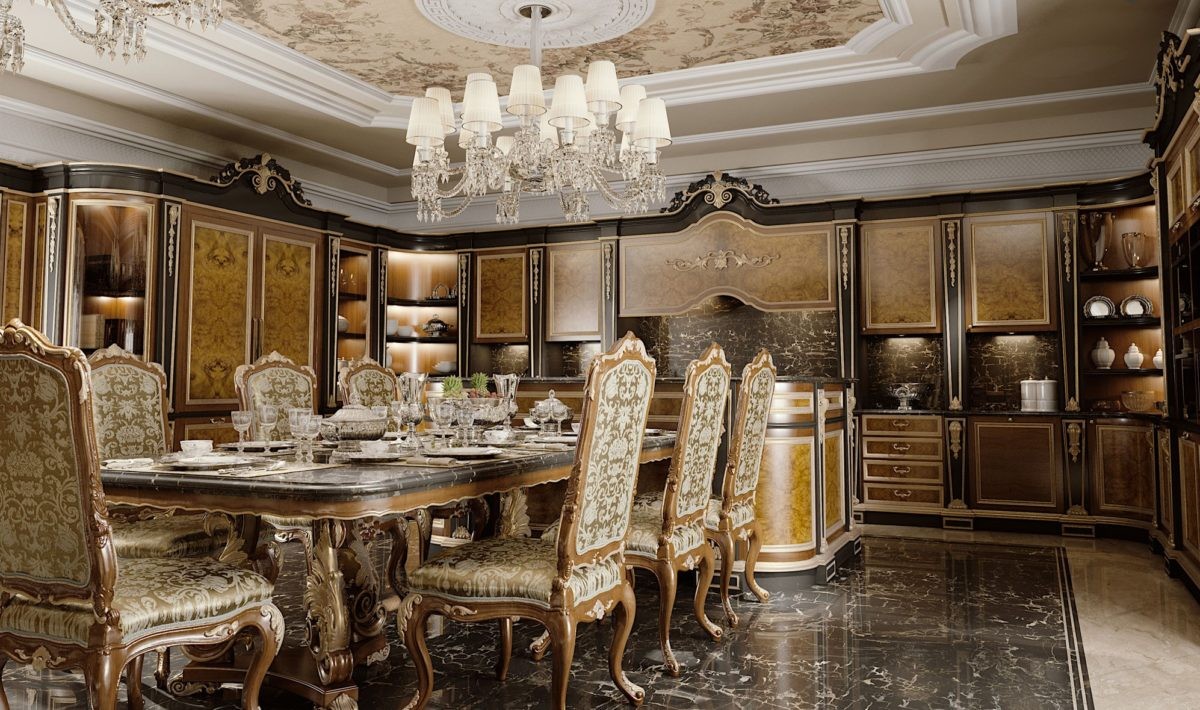 Обеденный стол можно разместить в отдельной столовой или на кухне, он должен быть круглым или прямоугольным. Стулья на резных ножках и обшиты парчой. Рабочую поверхность стоит сделать из камня. Для декора подойдет фарфоровая посуда с золотой каймой, старинные часы и подсвечники.