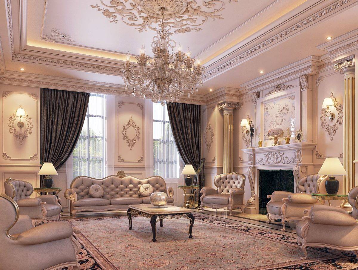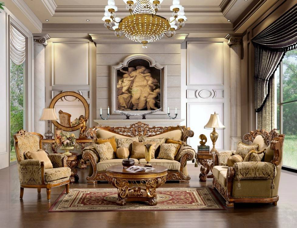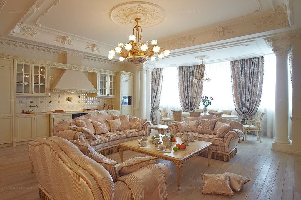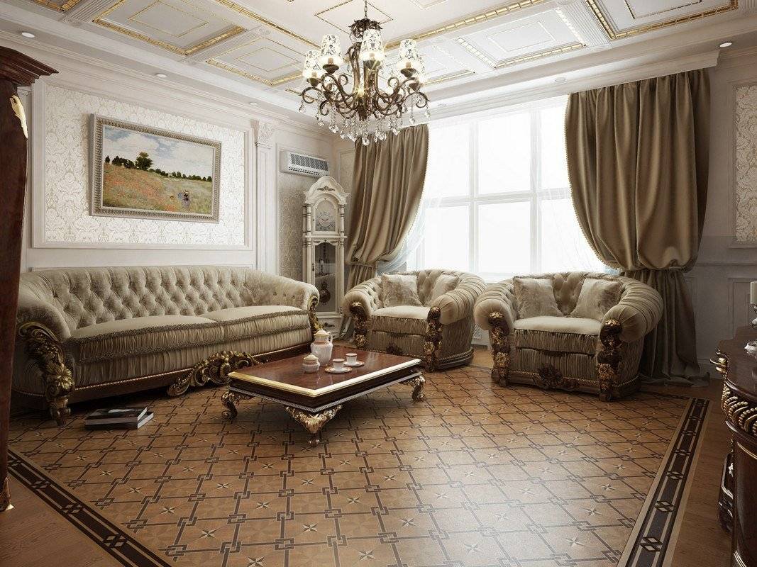 В гостиную нужно выбирать мебель на резных ножках, с изогнутыми подлокотниками, глубокими спинками. Из цвета можно выбрать сочетание золота с зеленым, бежевым или рубиновым. Для отделки стен подойдут тканевые или жидкие обои. Обильное украшение потолка уместно в том случае, если он достаточно высокий. Орнаменты и узоры из лепки могут переходить со стены на потолок, стирая границу.